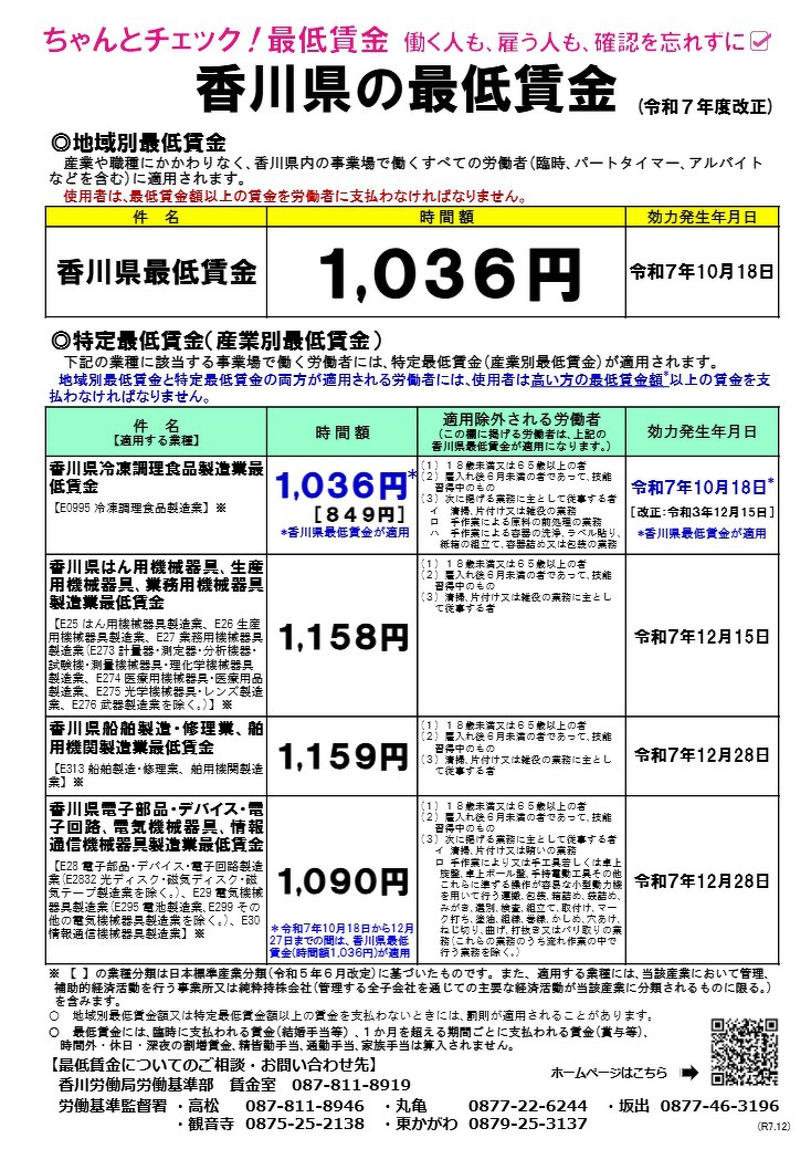 香川県の特定最低賃金の改正について(香川労働局) 今般、香川労働局から「香川県の特定最低賃金の改正」に係る周知依頼がありましたのでお知らせします。 香川労働局ホームページはこちら https://jsite.mhlw.go.jp/kagawa-roudoukyoku/hourei_seido_tetsuzuki/saiteichingin.html 周知依頼(要請)