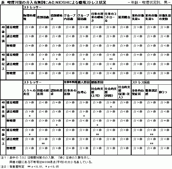 - 喫煙対策についてNIOSHによる職場ストレス状況から観察すると、40歳以上の現在喫煙者に比較的多くの影響がみられるが、一部の事項を除けば必ずしも悪影響を及ぼしていないことが推察された。
